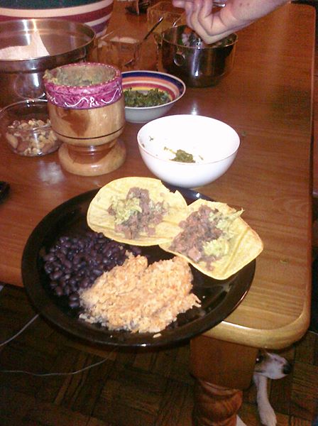 Tacos de luenga (topped with chopped onion and cilantro) spanish rice and black beans on the side